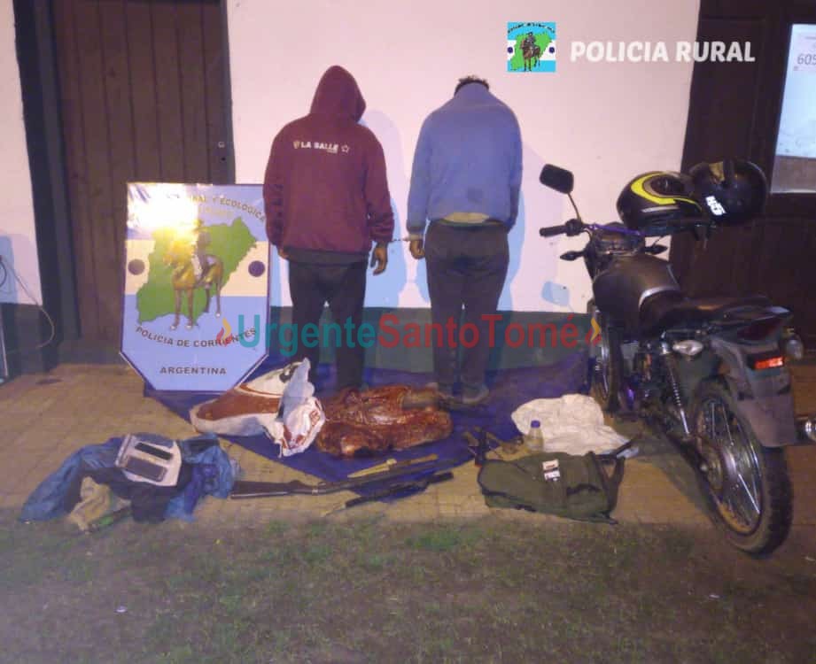 Por Urgente Santo Tomé 12/09/2024La policía Rural de Santo Tomé detuvo a dos hombres, Julián Jonatán O. y Alan Agustín B., que circulaban en una motocicleta Honda con un animal faenado (capibara) y portaban armas blancas (cuchillo y machete). También se encontró un arma de fuego (carabina calibre 22 mm) en los alrededores.