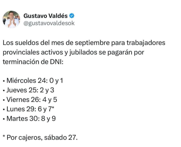 El primer mandatario provincial Gustavo Valdés dio a conocer los días de pago del sueldo correspondiente a septiembre, entre este miércoles 24 y martes 30. El beneficio alcanza a los agentes activos, jubilados y pensionados.