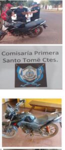 En la jornada de hoy 30-01-26, efectivos policiales de la Comisaría de Distrito Primera de Santo Tomé realizando un control vehicular e identificación de personas, secuestraron una motocicleta con pedido de secuestro por parte de las autoridades de la ciudad de Garupá-Provincia de Misiones, por hallarse de denunciada como sustraída. Asimismo, demoraron a su conductor.