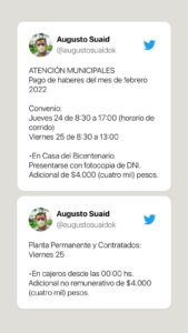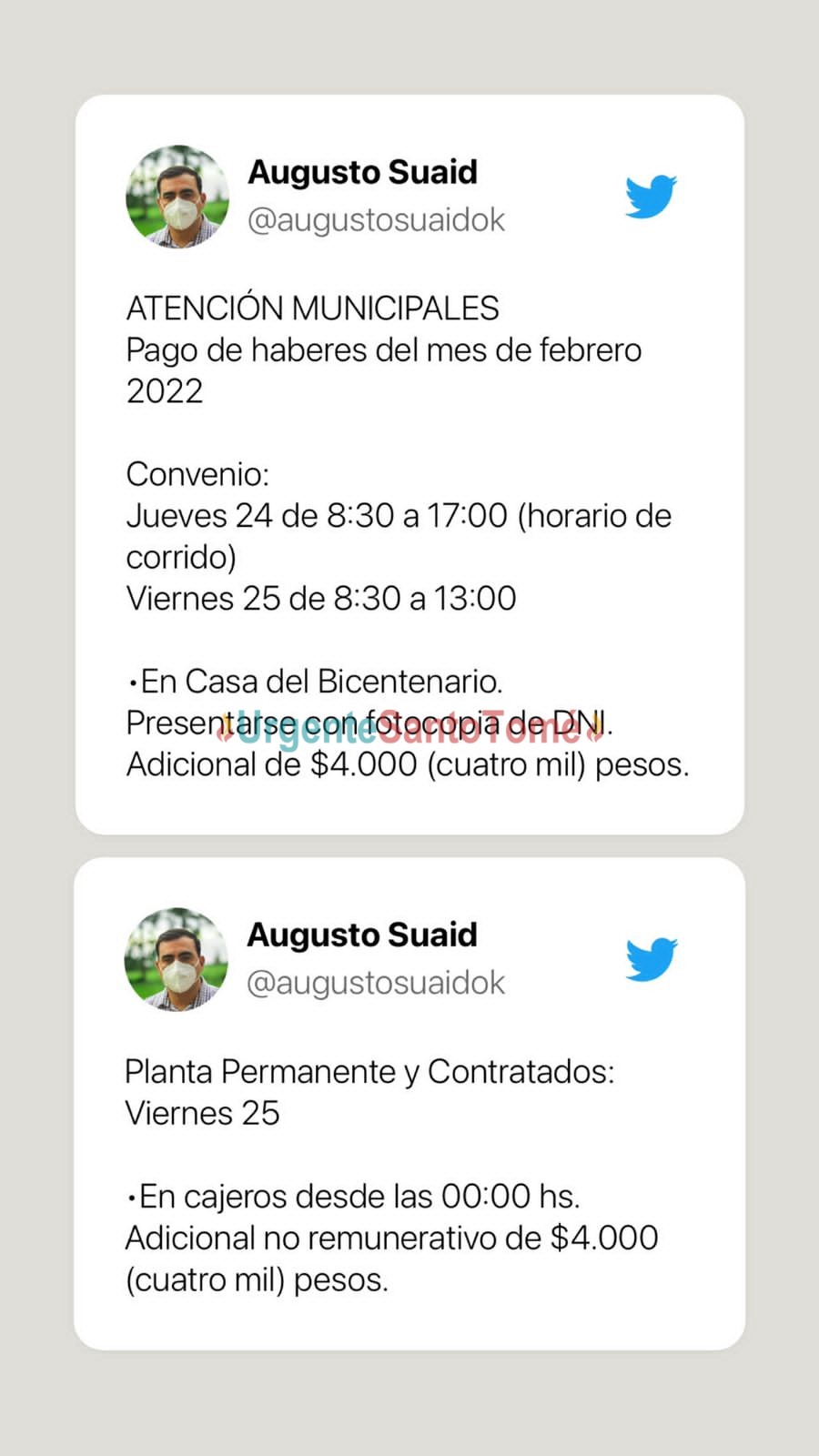 Por Urgente Santo Tomé 23/02/2022 El Intendente de la ciudad de Santo Tomé Augusto Suaid a través de las plataformas digitales anunció en la mañana de hoy el pago de haberes para los trabajadores municipales con un adicional de 4 mil pesos para la compra de útiles escolares. El comunicado fue difundido en la mañana de este 23/02 por el propio jefe comunal. Los obreros comunales de convenio percibirán su sueldos el jueves 24 de febrero de 8,30 a 17 hs en casa del Bicentenario y deben llevar fotocopia del dni y los trabajadores de contratados y planta permanente cobraran el viernes 25/02 en los cajeros automáticos de la ciudad.