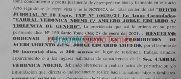 Por Urgente Santo Tome 28-01-2021 El Juzgado de Instrucción de Santo Tome ordeno en las últimas horas una orden perimetral y de restricción para el locutor Jorge Eduardo Amuedo, acusado del delito de Violencia de genero por Verónica Cabral. La acción judicial dictada por la Jueza Subrrogante Maria Zovack se concreto luego de 15 días de haber trascurrido el accidente vial, donde se habría producido el acto delictual. Veronica Cabral, que había denunciado a Amuedo por amenazas y maltrato y humillación declaro a este medio que vive en estado de pánico y miedo por alguna represalia del polémico comunicador. En el oficio librado en la noche de ayer a la Comisaria Primera de Santo Tome para que haga cumplir la orden señala ‘ Ordenar precautoriamente la prohibición de acercamiento del Sr. Jorge Eduardo Amuedo por el termino de 90 días a 200 metros del lugar de residencia, trabajo, estudio, esparcimiento de concurrencia o a lugares habituales de la Sra. Verónica Cabral, debiéndose abstenerse de realizar actos de perturbación o intimidación a la denunciante o a familiares’. La contundente medida contra Amuedo evidencia que para la justicia hay elementos suficientes para procesarlo por el delito de violencia de genero, etapa judicial que se podría concretar en los próximos días . En el día de ayer, en una entrevista brindada a Radio Sudamericana Amuedo afirmo que la denuncia de Verónica Cabral era una causa inventada y la justicia no acciono en ningún momento, ahora con esta medida dictada por la magistrada mencionada, la justicia santotomena da sus primeros pasos para tratar de determinar que paso el pasado 13-01. Según fuentes consultadas por www.urgentesantotome.com la próxima orden del Juzgado es citar a declarar en carácter de imputado al acusado, lo que podría suceder en las próximas horas. Ampliaremos.