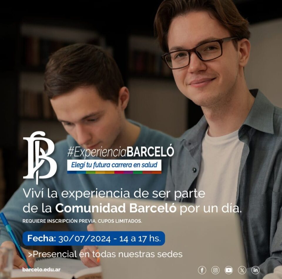 El martes 30 de julio, de 14 a 17 hs., desarrollarán actividades presenciales en cada una de sus sedes Buenos Aires, La Rioja y Santo Tomé -Corrientes- y en simultáneo, para dar a conocer todo lo referido a la oferta de carreras en salud que tiene la Fundación Barceló y presentar escenarios dinámicos e interactivos para que los jóvenes puedan experimentar cómo es ser parte de la Comunidad Barceló por un día.