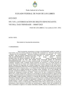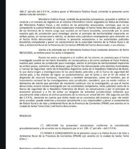 Por Urgente Santo Tomé 27/10/2025 El Juzgado Federal de Paso de los Libres desestimó y mandó a archivo un pedido de investigación a la Policía Rural de Corrientes con asiento en Santo Tomé por supuestos hechos de violencia contra un pescador brasileño , que denunció que autoridades argentinas habrían sido los autores materiales del ataque que habría sufrido mientras pescaba. En una resolución concretada el 21 de octubre con Caratula » Averiguación de delito» denunciado por la mujer del pescador Sanborjense Vicosa Tais Trindade, el Juzgado Federal de la ciudad de Paso de los Libres ordenó el archivo y devolución de la investigacion a las autoridades de Brasil. A propósito de esta determinación, el Juzgado considera , que a dichos de la misma denunciante, los hechos denunciados habrian ocurrido en territorio brasileño y es por tal que la Argentina no tiene jurisdicción para abrir una investigación al respecto. Por otra parte fuentes consultadas por este diario desestimaron las aseveraciones de la esposa del pescador de San Borja quien habría afirmado que habría pruebas de que miembros de la policía rural de Santo Tomé encima de una embarcación abordaron y agredieron a Jara. Las fuentes afirmaron que es imposible que miembros de la policia rural utilicen embarcaciones para concretar patrullajes y consideran una total falta de seriedad los dichos de la mujer de la supuesta víctima.