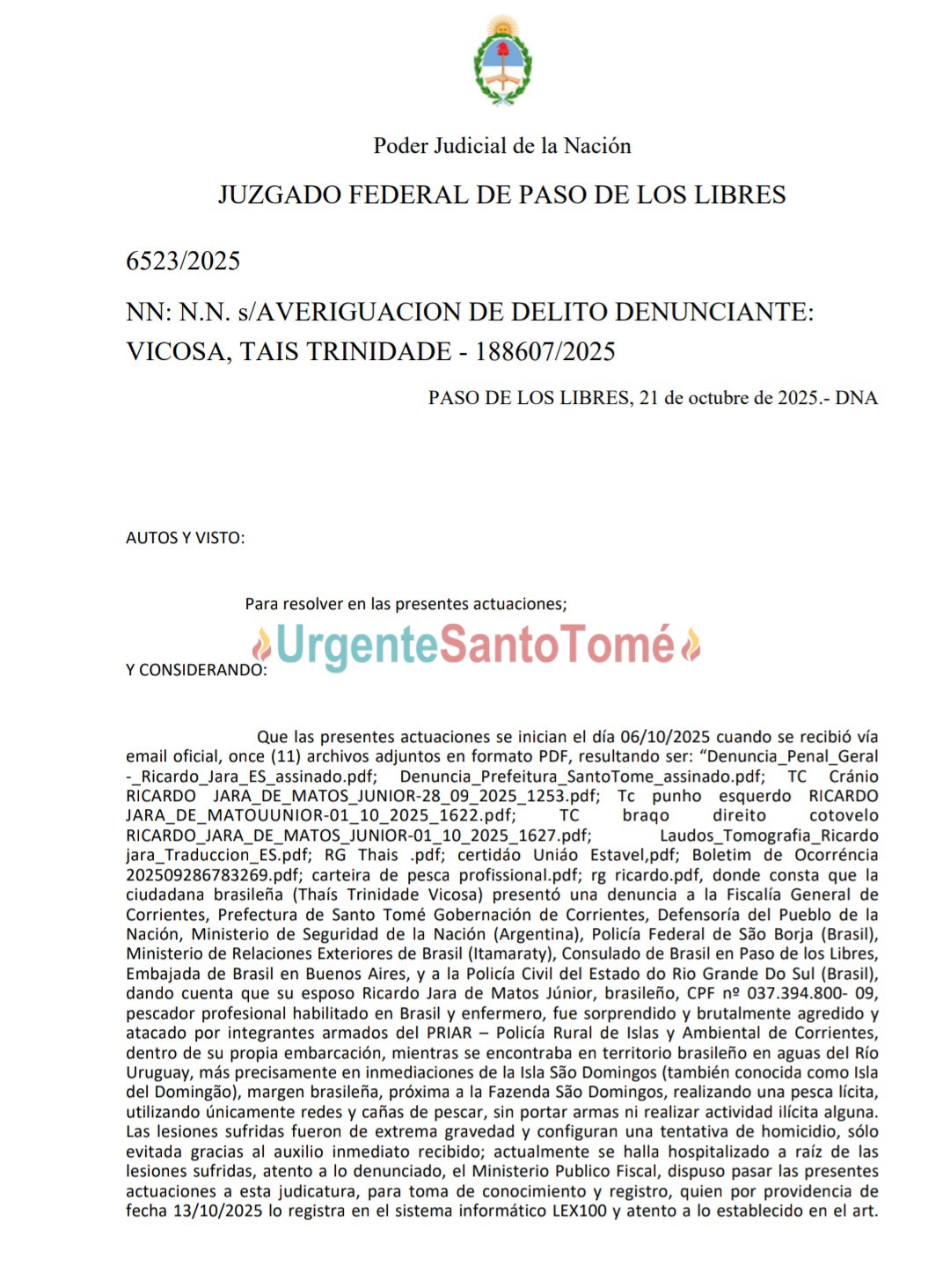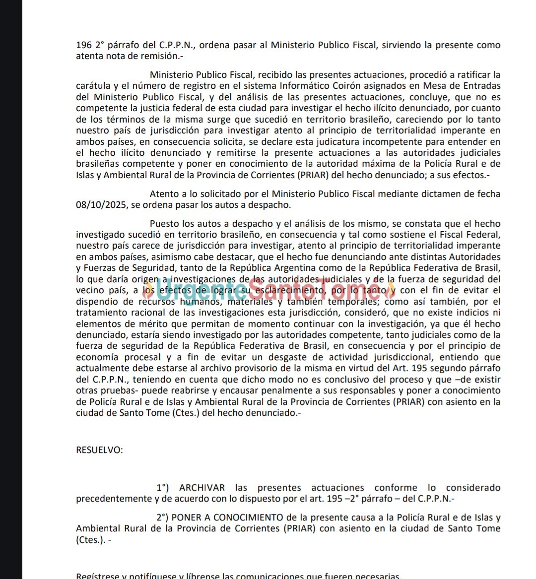 Por Urgente Santo Tomé 27/10/2025 El Juzgado Federal de Paso de los Libres desestimó y mandó a archivo un pedido de investigación a la Policía Rural de Corrientes con asiento en Santo Tomé por supuestos hechos de violencia contra un pescador brasileño , que denunció que autoridades argentinas habrían sido los autores materiales del ataque que habría sufrido mientras pescaba. En una resolución concretada el 21 de octubre con Caratula » Averiguación de delito» denunciado por la mujer del pescador Sanborjense Vicosa Tais Trindade, el Juzgado Federal de la ciudad de Paso de los Libres ordenó el archivo y devolución de la investigacion a las autoridades de Brasil. A propósito de esta determinación, el Juzgado considera , que a dichos de la misma denunciante, los hechos denunciados habrian ocurrido en territorio brasileño y es por tal que la Argentina no tiene jurisdicción para abrir una investigación al respecto. Por otra parte fuentes consultadas por este diario desestimaron las aseveraciones de la esposa del pescador de San Borja quien habría afirmado que habría pruebas de que miembros de la policía rural de Santo Tomé encima de una embarcación abordaron y agredieron a Jara. Las fuentes afirmaron que es imposible que miembros de la policia rural utilicen embarcaciones para concretar patrullajes y consideran una total falta de seriedad los dichos de la mujer de la supuesta víctima.