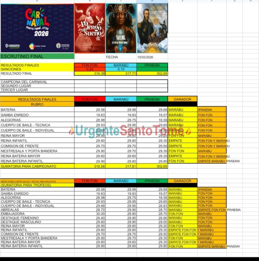 Por Urgente Santo Tomé 16/02/2026 Al cierre de esta edición , fuentes de la Comisión Central del Carnaval informaron que, luego de la apertura de sobres con la puntuación de cada rubro, comparsa Marabú ganó de nuevo la competencia y se transformó en la pentacampeona de los Corsos de esta ciudad. La entrega de premios se concretará este lunes 16 en una Casa de Juegos local. Ampliaremos