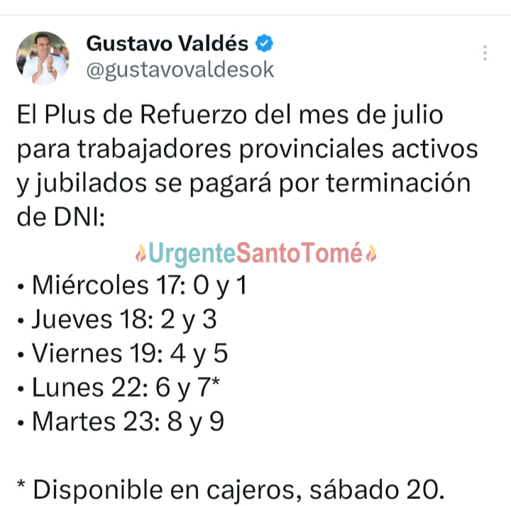 Por Urgente Santo Tomé 16/07/2024 través de sus redes sociales, @gustavovaldesok, el gobernador Gustavo Valdés informó los días de pago del cronograma de este beneficio. Comienza este miércoles 17 y se extiende en cinco días. Alcanza a los agentes de la administración pública provincial.