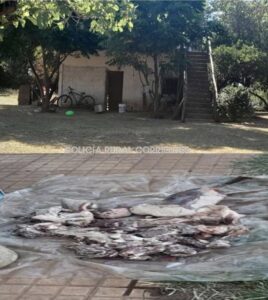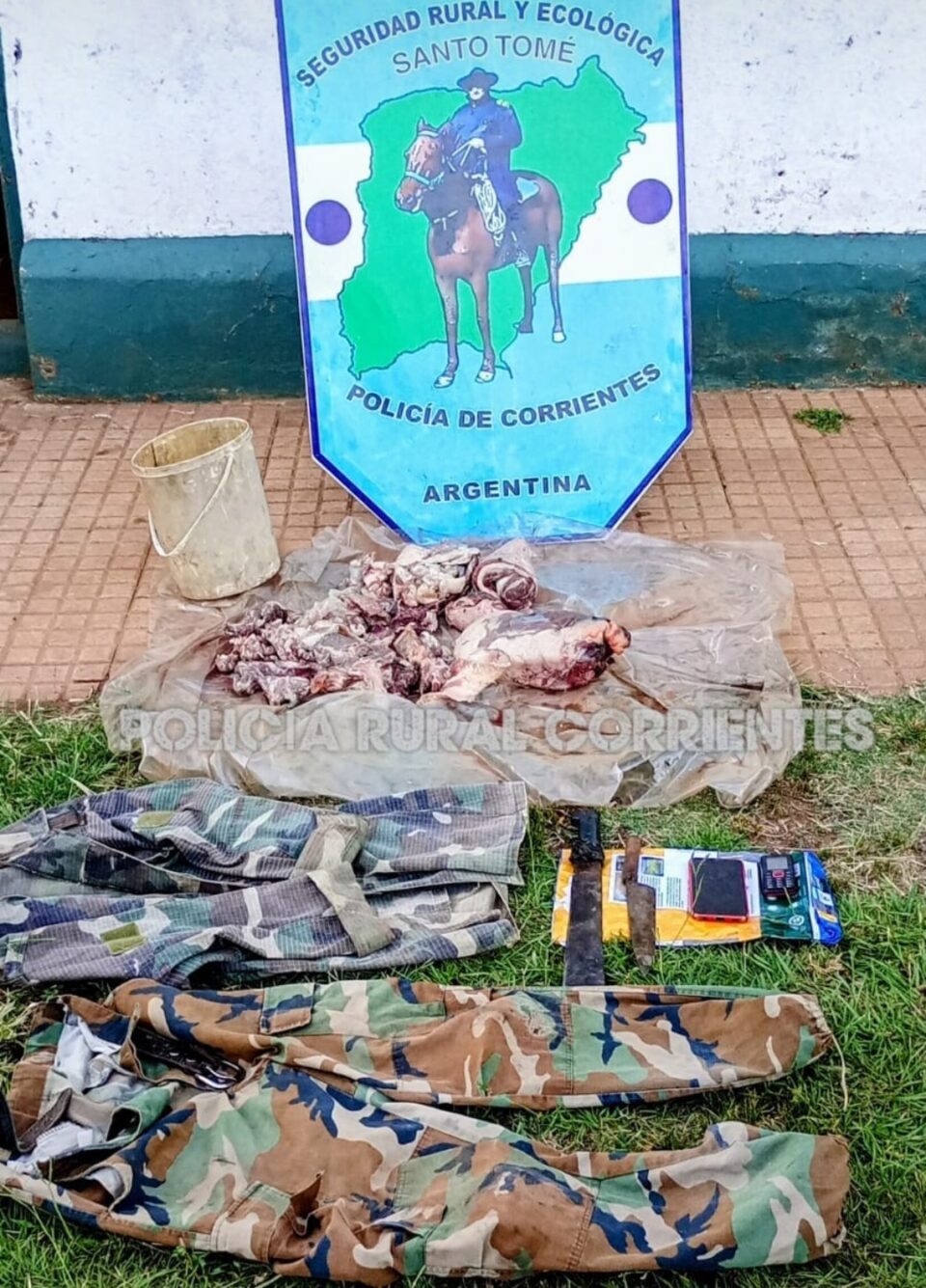 Lo llamativo es que las huellas quedaron muy cerca de una vivienda en el paraje Puerto Hormiguero. El dueño sería brasileño y ya tendría antecedentes por abigeato. Con la orden del fiscal rural, doctor Leiva, se allanó la casa. Allí encontraron restos de carne en descomposición, dos celulares y ropa tipo uniforme mimetizado.
