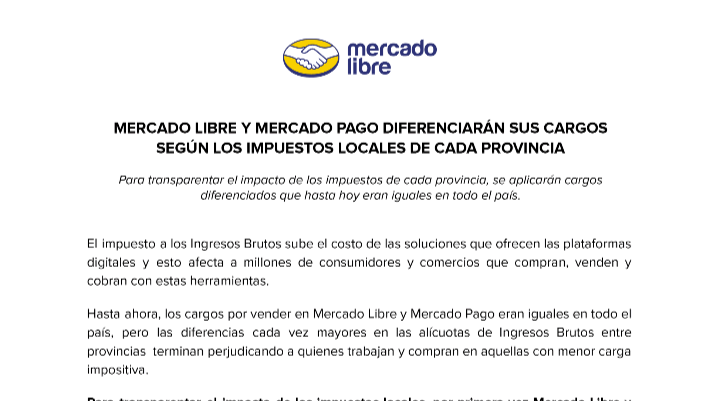Mercado Libre y Mercado Pago remarcaron que el impuesto a los Ingresos Brutos es una carga «distorsiva», ya que encarece productos y servicios, va en contra de la formalización, reduce la competitividad y genera mayores costos tanto para vendedores como para consumidores.