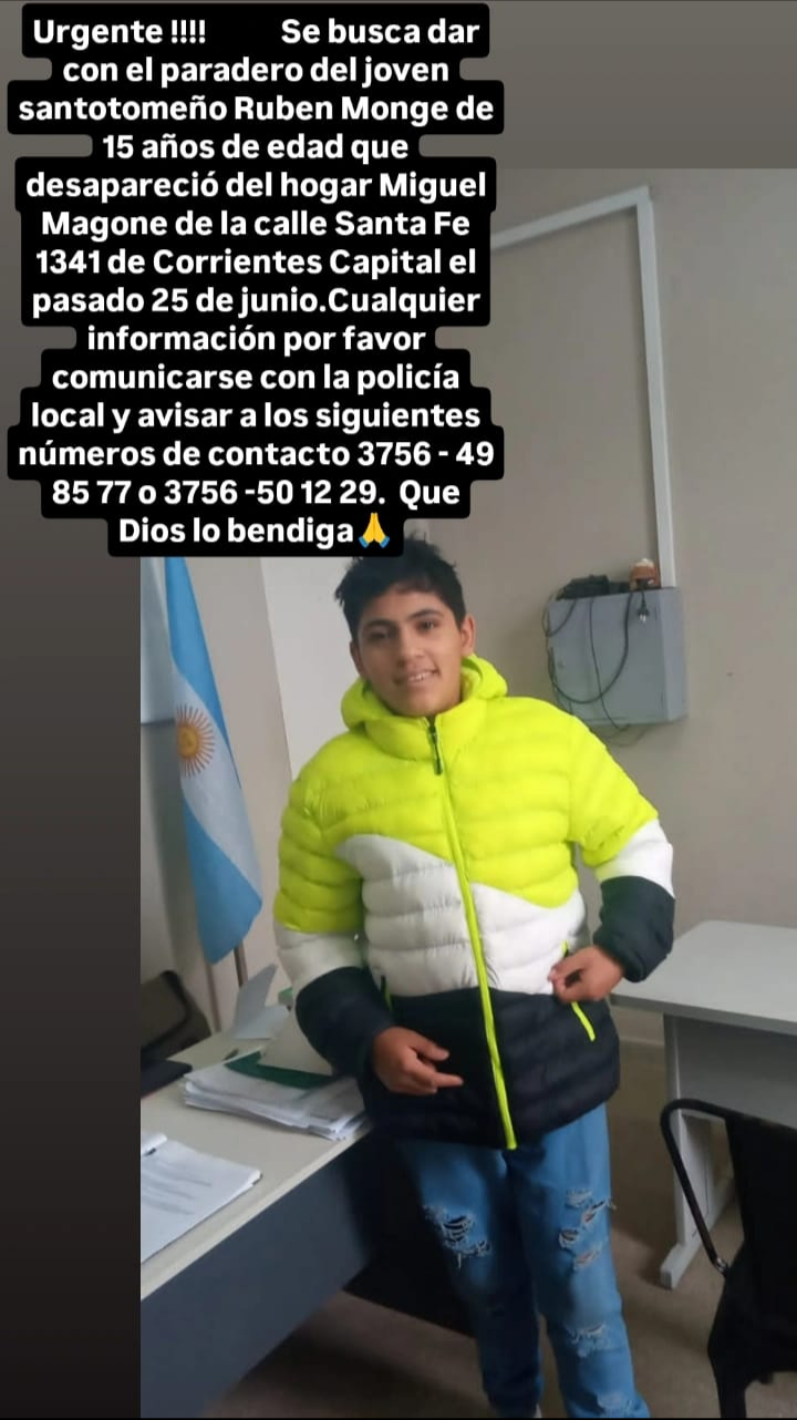 Por Urgente Santo Tomé 07/07/2025 Un adolescente oriundo de la ciudad de Santo Tomé fue reportado como desaparecido del Hogar de Menores Miguel Magone, de la ciudad de Corrientes Capital. Se trata de Rubén Monge, de 15 años de edad quien estaba internado en esa institución como consecuencia de consumos de estupefacientes y hechos delictivos.
