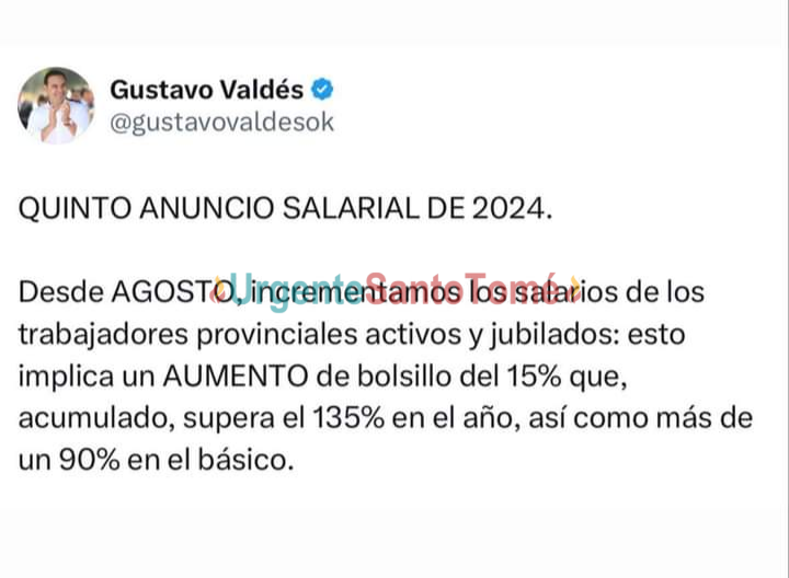 Por Urgente Santo Tomé 25/07/2024El gobernador, Gustavo Valdés, anunció este jueves que se incrementará un 15% el sueldo de los empleados estatales.