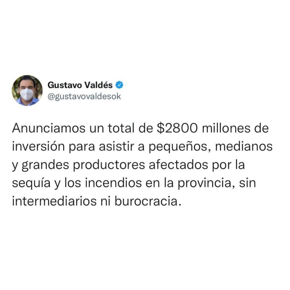 El gobernador Gustavo Valdés brindó una conferencia de prensa en donde anunció asistencia financiera para los productores afectados por los incendios y la sequía en la provincia. En total, la inversión por parte del Estado será de 2.800 millones de pesos “sin burocracias e intermediarios de manera que podamos llegar de manera inmediata”, en palabras del mandatario.