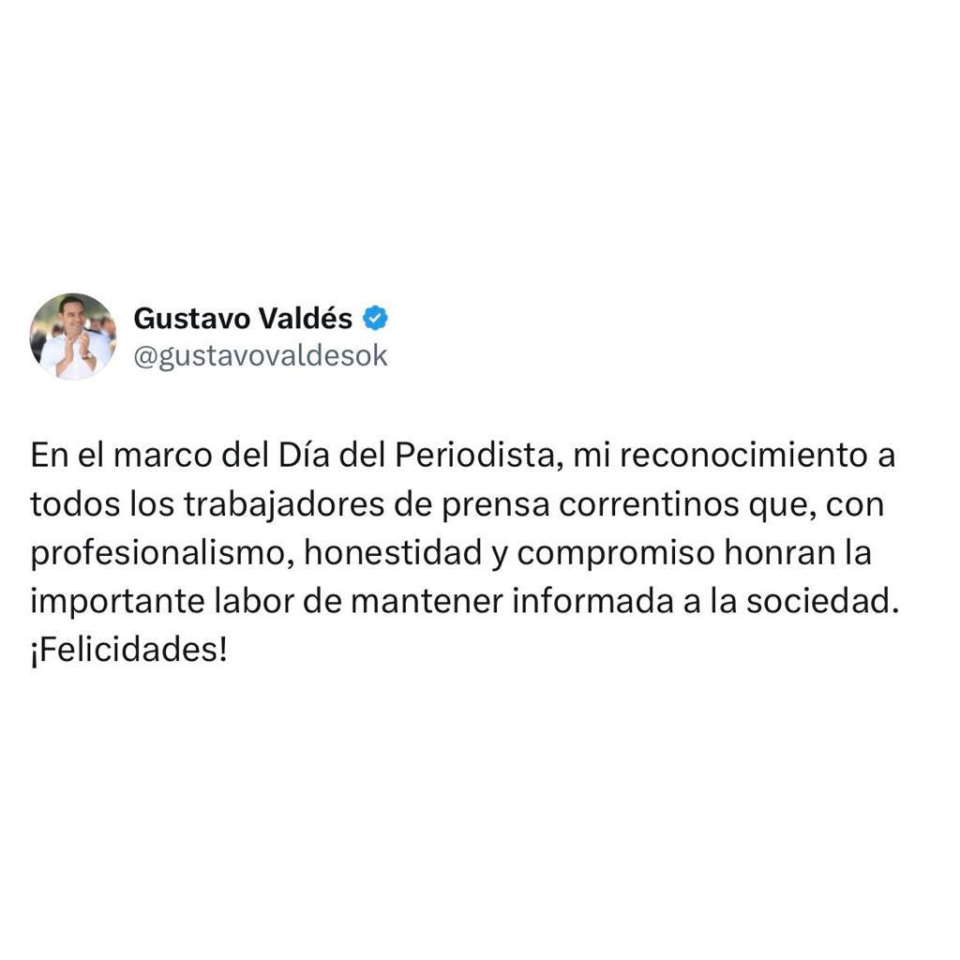 Por Urgente Santo Tome 07/06/2023 El gobernador Gustavo Valdés este miércoles, a través de su cuenta de Twitter @gustavovaldesok, en el marco del Día del Periodista, expresó su salutación a periodistas correntinos.